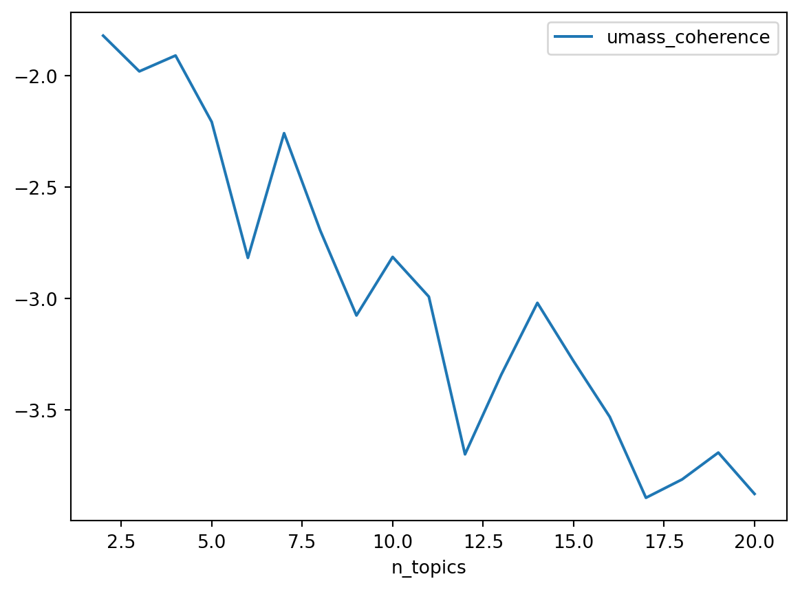 Naturally, the next step would be to test a range of values for num_topics to evaluate which ones gives the best UMass coherence score. This is easily done by extending the LDA class we created previously.