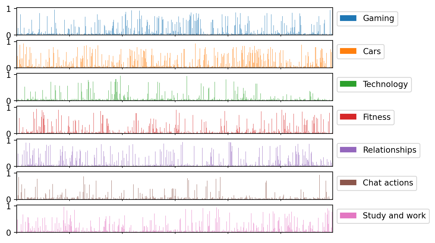 These topics are pretty unsurprising given the chat participants (18-23 year old dudes), however it’s reassuring that the results produced by LDA are as expected. As a final bit of analysis, we can plot the topic distributions over documents (conversations) to visualise how topics changed over time.